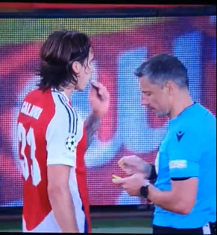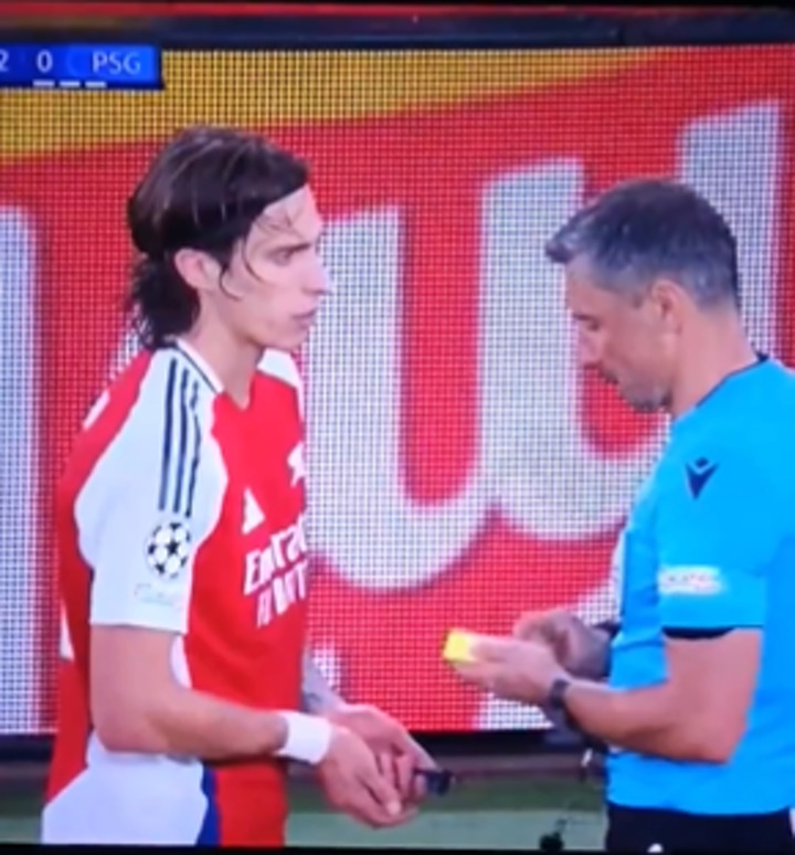 Calafiori walked away from the referee, immediately putting the object into his mouth.