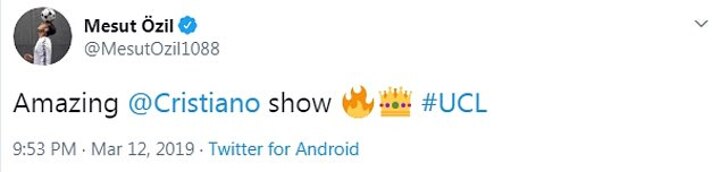 And it wasn't just the supporters who were singing Ronaldo's praises. Arsenal playmaker Mesut Ozil, a former team-mate of Ronaldo at Real Madrid, said: 'Amazing Cristiano show.'