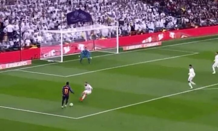 19 minutes later Dembele sent a dangerous low cross into the Madrid penalty area which Raphael Varane could only divert into his own net.