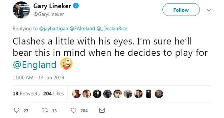Gary Lineker replied, suggesting otherwise: 'Clashes a little with his eyes. I’m sure he’ll bear this in mind when he decides to play for @England'.