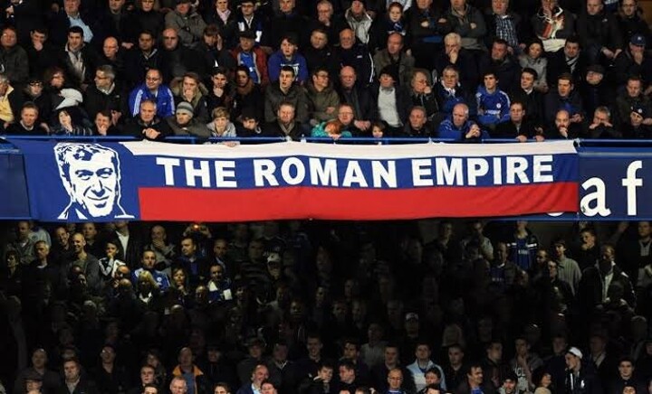 "The Roman Empire" boldly written on a Russian flag with a picture of Roman Abramovich at Stamford Bridge.