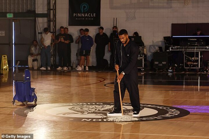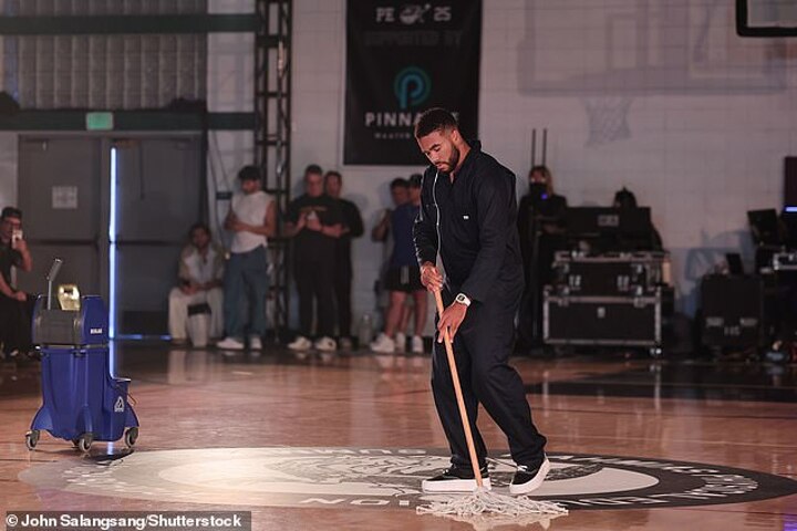 The event had an American high school theme, with James dressing up in the role as a janitor, and acting with a mop and bucket.