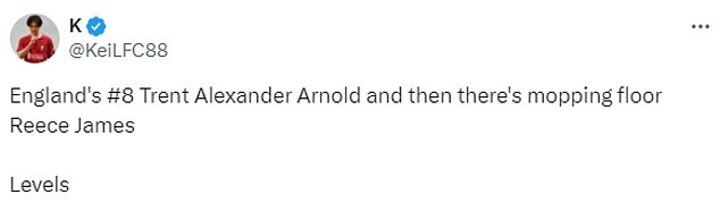 Another linked to the official England portrait of the Liverpool star, and noted: 'England's #8 Trent Alexander Arnold and then there's mopping floor Reece James. Levels'.