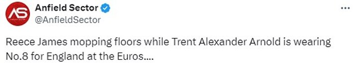 One wrote on X (fka Twitter): 'Reece James mopping floors while Trent Alexander Arnold is wearing No.8 for England at the Euros....'
