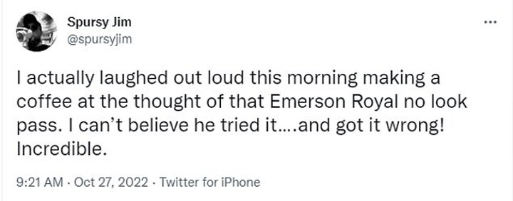 Another reacted by tweeting: 'I actually laughed out loud this morning making my coffee at the thought of that Emerson Royal no-look pass. I can't believe he tried it... and got it wrong! Incredible.'