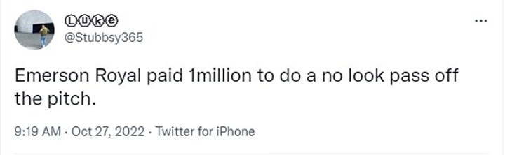 Another tweeted: 'Emerson Royal paid £1million to do a no look pass of the pitch'.