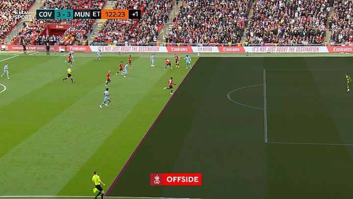 Fans believe the VAR lines were drawn over Aaron Wan-Bissaka's foot for Haji Wright's offside in Manchester United's FA Cup semi-final win over Coventry City.