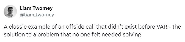 One fan said: 'A classic example of an offside call that didn't exist before VAR - the solution to a problem that no one felt needed solving.'