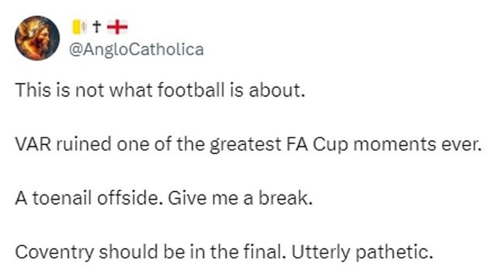'This is not what football is about. VAR ruined one of the greatest FA Cup moments ever. A toenail offside. Give me a break. Coventry should be in the final. Utterly pathetic,' one viewer fumed.