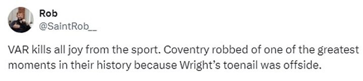 Another added: 'VAR kills all the joy of sport. Coventry robbed of one of the greatest moments in their history because Wright's toenail was offside.'