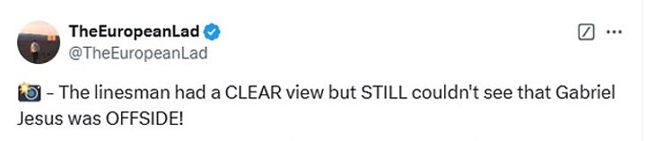 'The linesman had a CLEAR view but STILL couldn't see that Gabriel Jesus was OFFSIDE!,' one fan complained on social media.