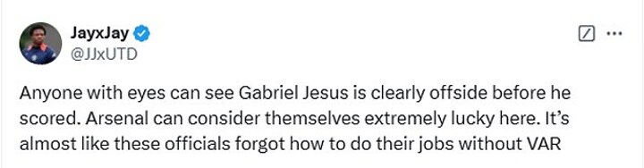 'Anyone with eyes can see Gabriel Jesus is clearly offside before he scored. Arsenal can consider themselves extremely lucky here,' another claimed.