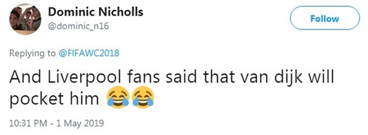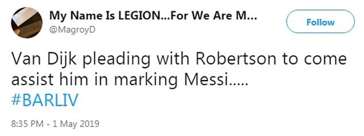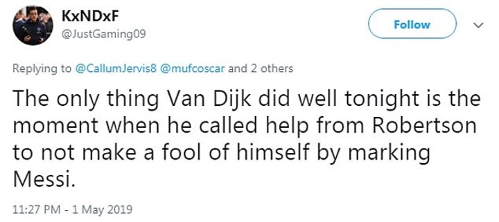 Another laughed: 'The only thing Van Dijk did well tonight is the moment when he called help from Robertson to not make a fool of himself by marking Messi.'