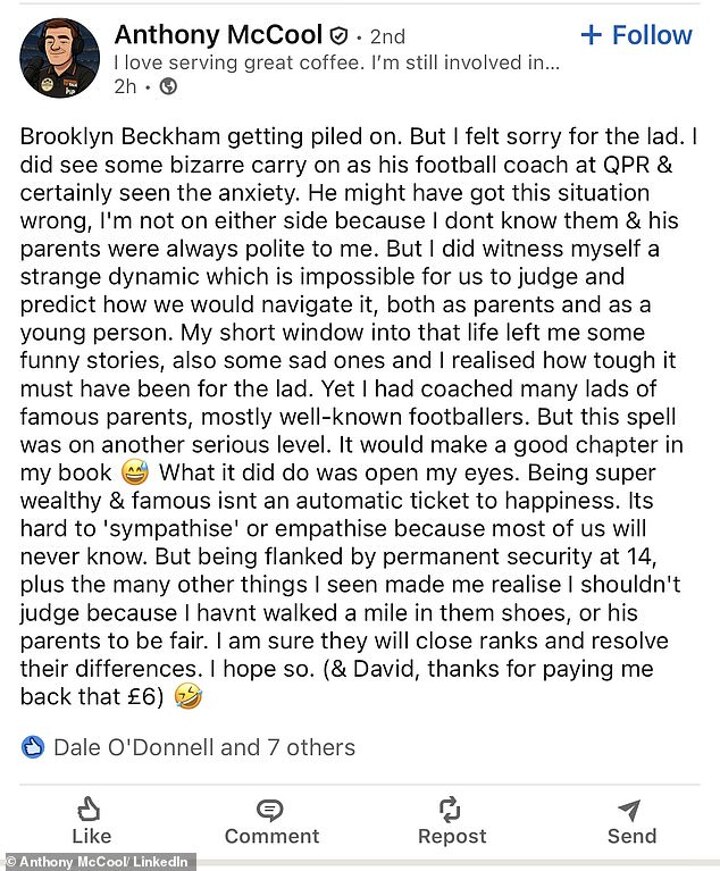 Former Norwich City, Bradford City and QPR coach Tony McCool took to LinkedIn on Thursday to share his own experience of dealing with Brooklyn in the midst of the eldest Beckham child's explosive statement about his parents earlier this week.