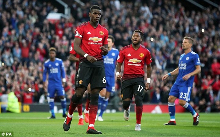 Pogba scored from the spot after just three minutes before Luke Shaw doubled the lead with his first senior goal. Jamie Vardy grabbed a consolation but United held on for the win.