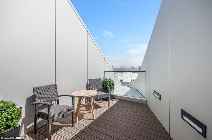 The penthouse has an enormous open-plan kitchen and living area and a decked terrace the looks out onto the River Thames and the Millennium Dome.