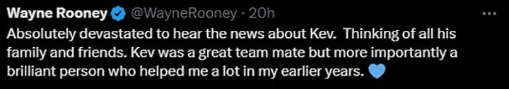 'Thinking of all his family and friends. Kev was a great team mate but more importantly a brilliant person who helped me a lot in my earlier years.'