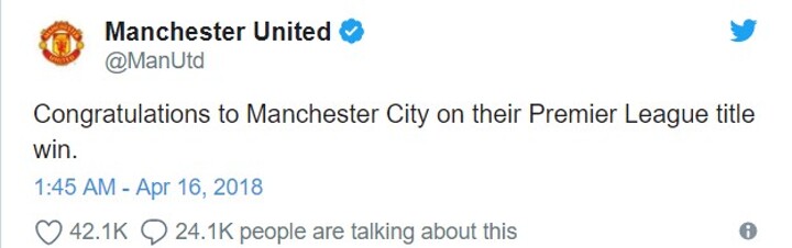 "Congratulations to Manchester City on their Premier League title win," read the message on United's Twitter account.