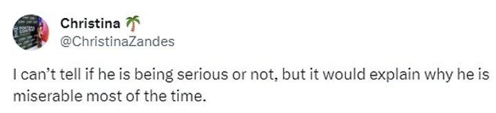 'I can’t tell if he is being serious or not, but it would explain why he is miserable most of the time,' added another.