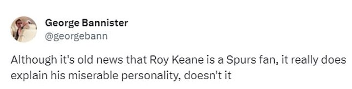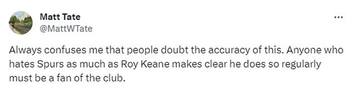 'Always confuses me that people doubt the accuracy of this. Anyone who hates Spurs as much as Roy Keane makes clear he does so regularly must be a fan of the club,' one fan wrote.