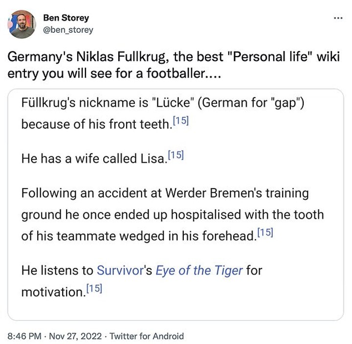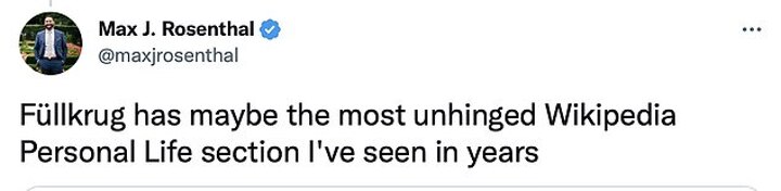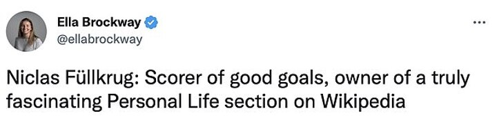 Washington Post Journalist Ella Brockway also got in the Fullkrug act, posting 'Niclas Füllkrug: Scorer of good goals, owner of a truly fascinating Personal Life section on Wikipedia.'