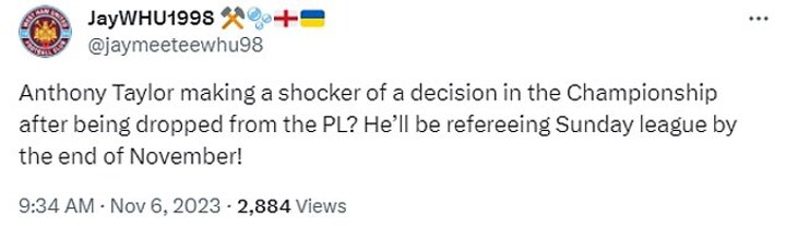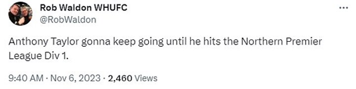 'Anthony Taylor gonna keep going until he hits the Northern Premier League Div 1,' another post reads.