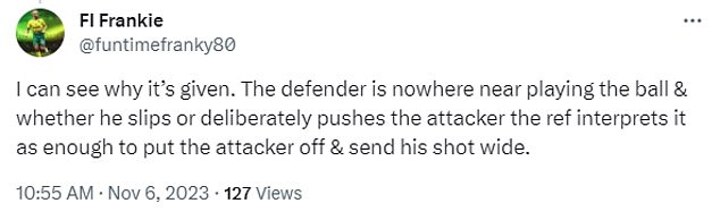 'I can see why it’s given. The defender is nowhere near playing the ball & whether he slips or deliberately pushes the attacker the ref interprets it as enough to put the attacker off & send his shot wide' another commented.