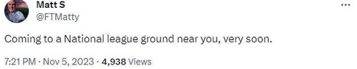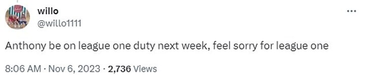 'Anthony be on league one duty next week, feel sorry for league one,' the post reads.