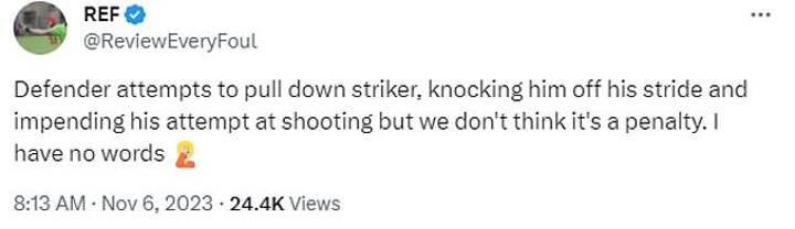 'Defender attempts to pull down striker, knocking him off his stride and impending his attempt at shooting but we don't think it's a penalty. I have no words,' one user tweeted.