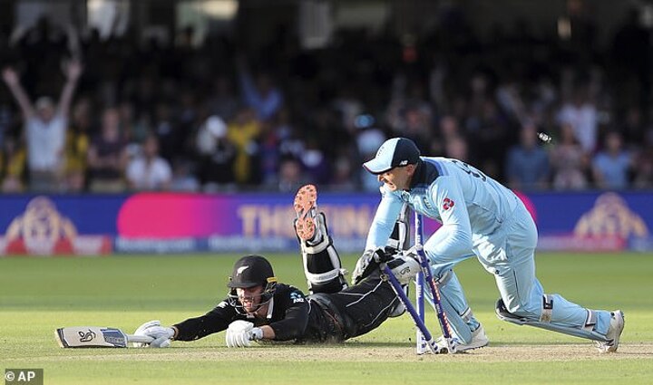The image shows England wicket-keeper Jos Buttler diving to run out New Zealand batsman Martin Guptill during the dramatic super over victory at Lord's.