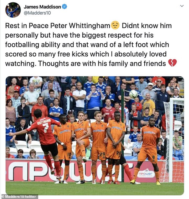 Leicester and England midfielder James Maddison wrote on Twitter: 'Rest in Peace Peter Whittingham. Didn't know him personally but have the biggest respect for his footballing ability and that wand of a left foot which scored so many free kicks which I absolutely loved watching. Thoughts are with his family and friends.'