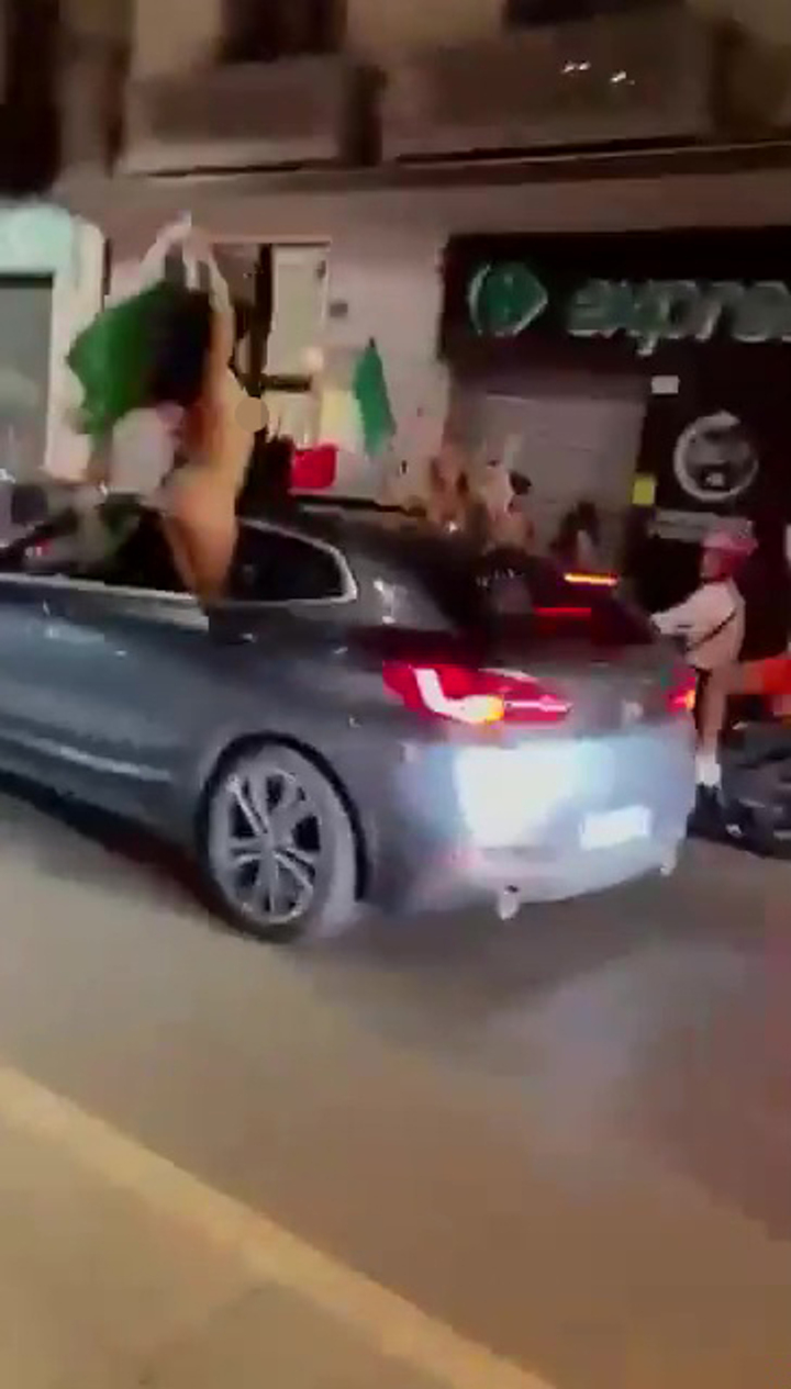 The excited woman was caught on camera being driven through the streets of Italy, parading the famous green, white and red tricolore with nothing but a pair of underpants on.