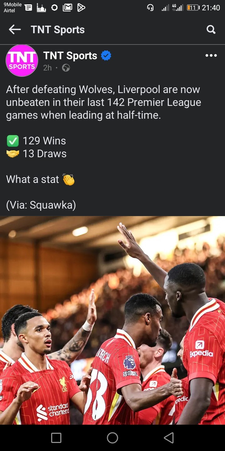 Liverpool are unbeaten in EPL in 142 games when leading at halftime with 129 wins!😲