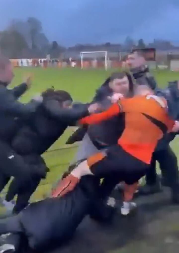 It is unclear what caused the huge melees, which saw the Bilston player trading punches with a group of men near the pitch-side railings.