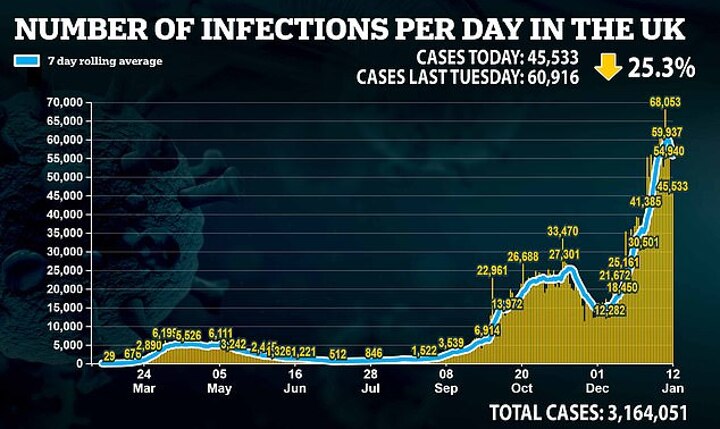 Latest data revealed that 45,533 people tested positive for the virus on Monday, taking the seven-day average down by 0.5 per cent – the first fall in weeks.