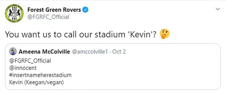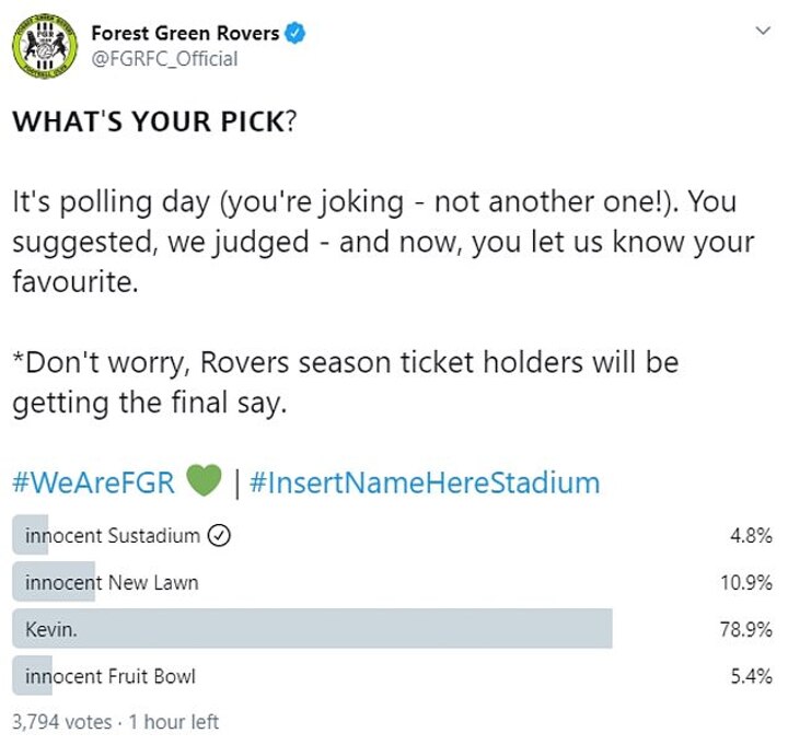 Forest Green Rovers' stadium could be renamed 'Kevin' after fans voted for that title in the club's own Twitter poll.