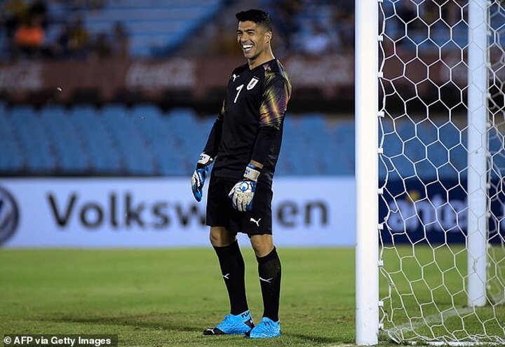 His countryman Luis Suarez also took time out to show his appreciation for Forlan, but while he can often be seen scoring goals for Barcelona, the Liverpool man opted to give goalkeeping a go as he featured in between the sticks.