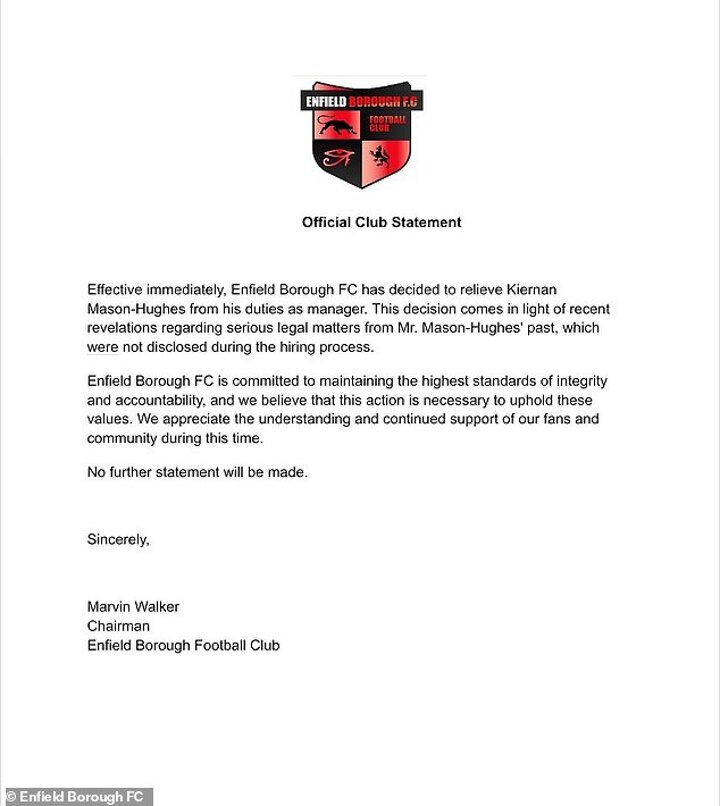 A statement issued by club chairman Marvin Walker yesterday evening read: 'Effective immediately, Enfield Borough FC has decided to relieve Kiernan Mason-Hughes from his duties as manager.