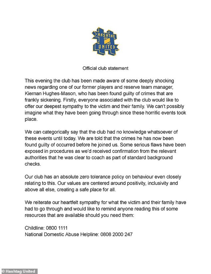 Semi-professional Essex side Hashtag United - where Hughes-Mason played and coached between 2020 and 2022 - also issued a statement on Wednesday night.