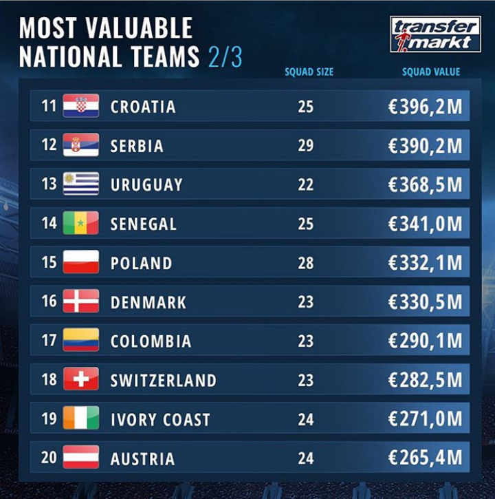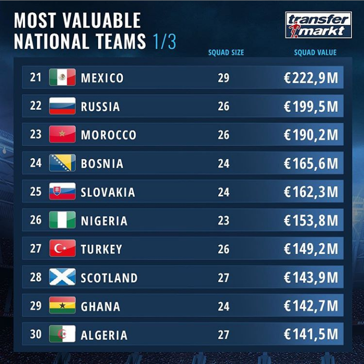 Football website transfermarkt.com has revealed the ranking for the 30 most valuable national teams.