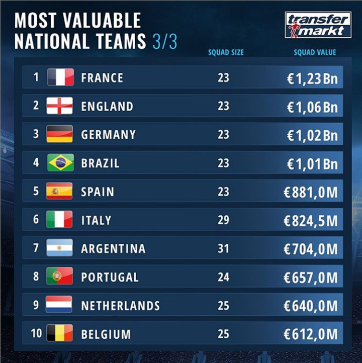 World Cup champions France top the list with little surprise as their 23 squad players combine to generate a squad value of 1.23 billion euros.