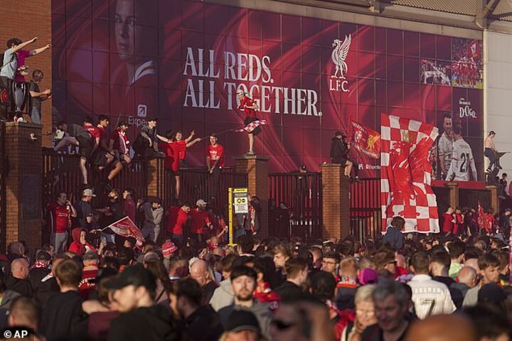 Thousands of supporters packed the streets while others scaled the railings by the Kop, waved scarves from the rooftops and even climbed onto a passing Greggs van to get the best view of the red sea which stretched all the way down Anfield Road.