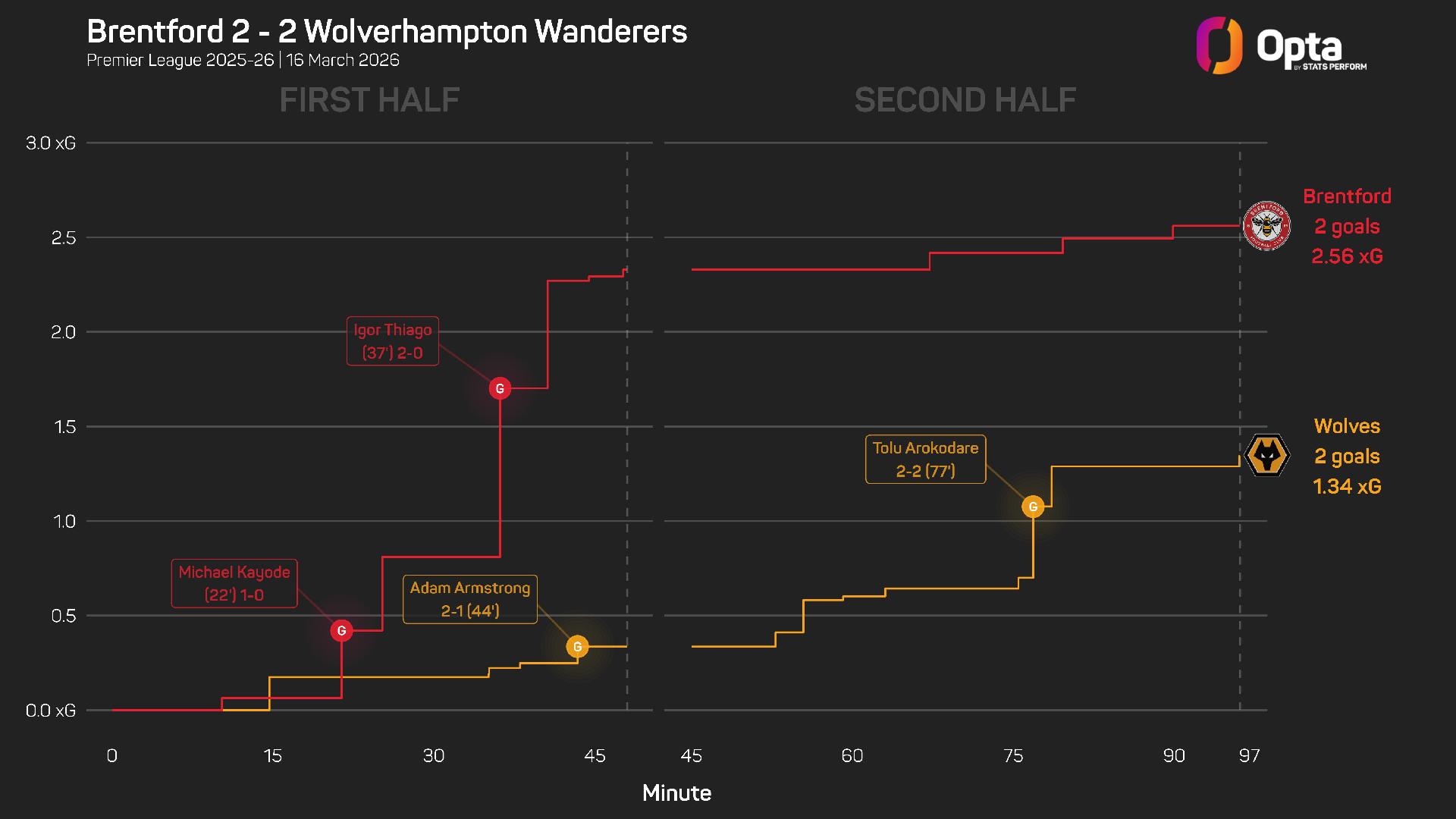 Brentford registered an expected goals (xG) total of 2.33 from their seven shots in the first half, but mustered just three attempts after the break worth an xG value of just 0.23, compared to Wolves' 1.01 in the second half.
