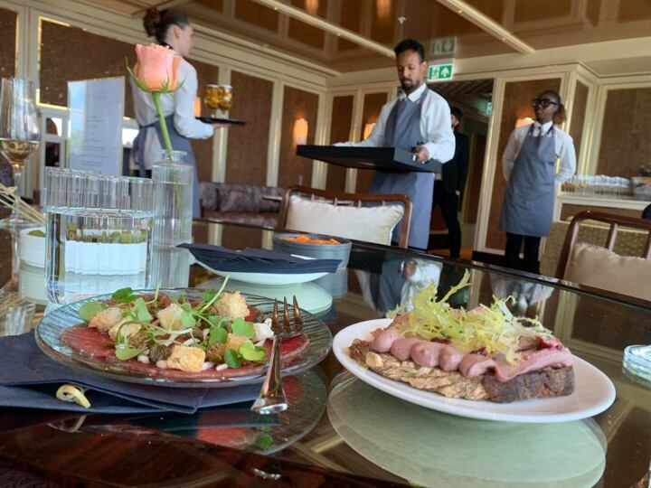 We are greeted with a glass of fizz and, as soon as we sit, smiling staff bring endless plates of beef carpaccio, scallops and venison.