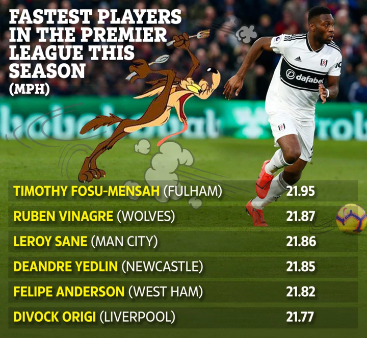 Timothy Fosu-Mensah has been revealed as the fastest player in the Premier League, reaching speeds of 21.95mph.