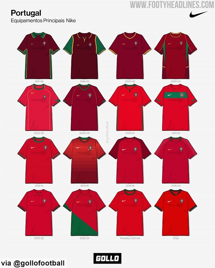 Euro 2024 will be the last major tournament in which Portugal will wear Nike kits before Puma takes over in 2025. Let's take a look back at all the Nike Portugal kits in history. Thanks to Gollo (@gollofootball).