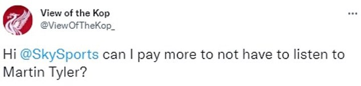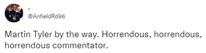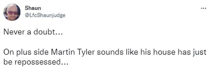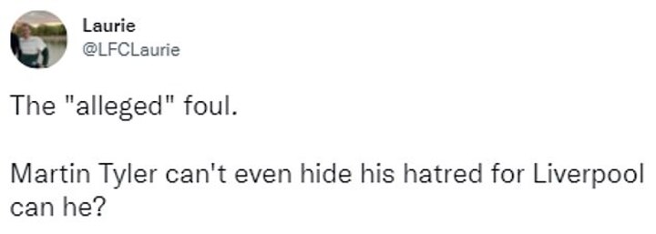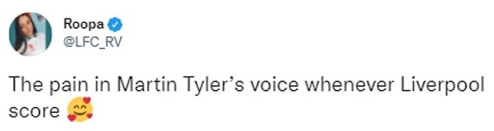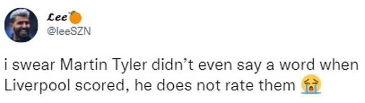 Another added: 'I swear Martin Tyler didn't even say a word when Liverpool scored, he does not rate them?'.