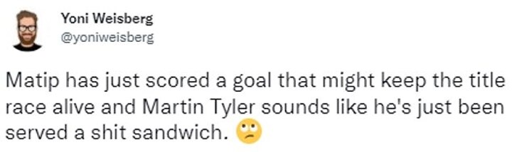 While one fan wrote: 'Matip has just scored a goal that might keep the title race alive and Martin Tyler sounds like he's just been served a shit sandwich.'