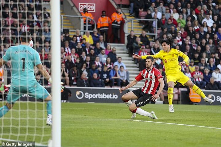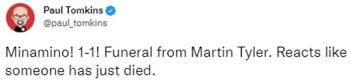 Another fan agreed by Tweeting the following: 'Minamino! 1-1! Funeral from Martin Tyler. Reacts like someone has just died.'