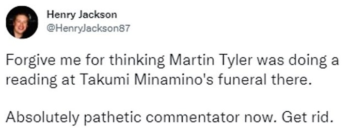 One furious fan took to Twitter to say: 'Forgive me for thinking Martin Tyler was doing a reading at Takumi Minamino's funeral there. Absolutely pathetic commentator now. Get rid.'